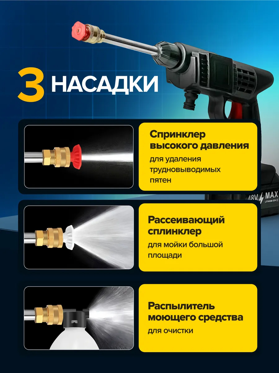В набор входит всё необходимое: аккумулятор, зарядное устройство, шланг, пенный генератор и насадки для распыления. Благодаря специальному пенообразователю вы сможете использовать моющее средство для создания густой пены, что обеспечит качественное смывание грязи и загрязнений с поверхности вашего автомобиля.