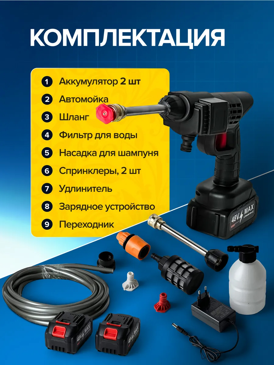 В набор входит всё необходимое: аккумулятор, зарядное устройство, шланг, пенный генератор и насадки для распыления. Благодаря специальному пенообразователю вы сможете использовать моющее средство для создания густой пены, что обеспечит качественное смывание грязи и загрязнений с поверхности вашего автомобиля.